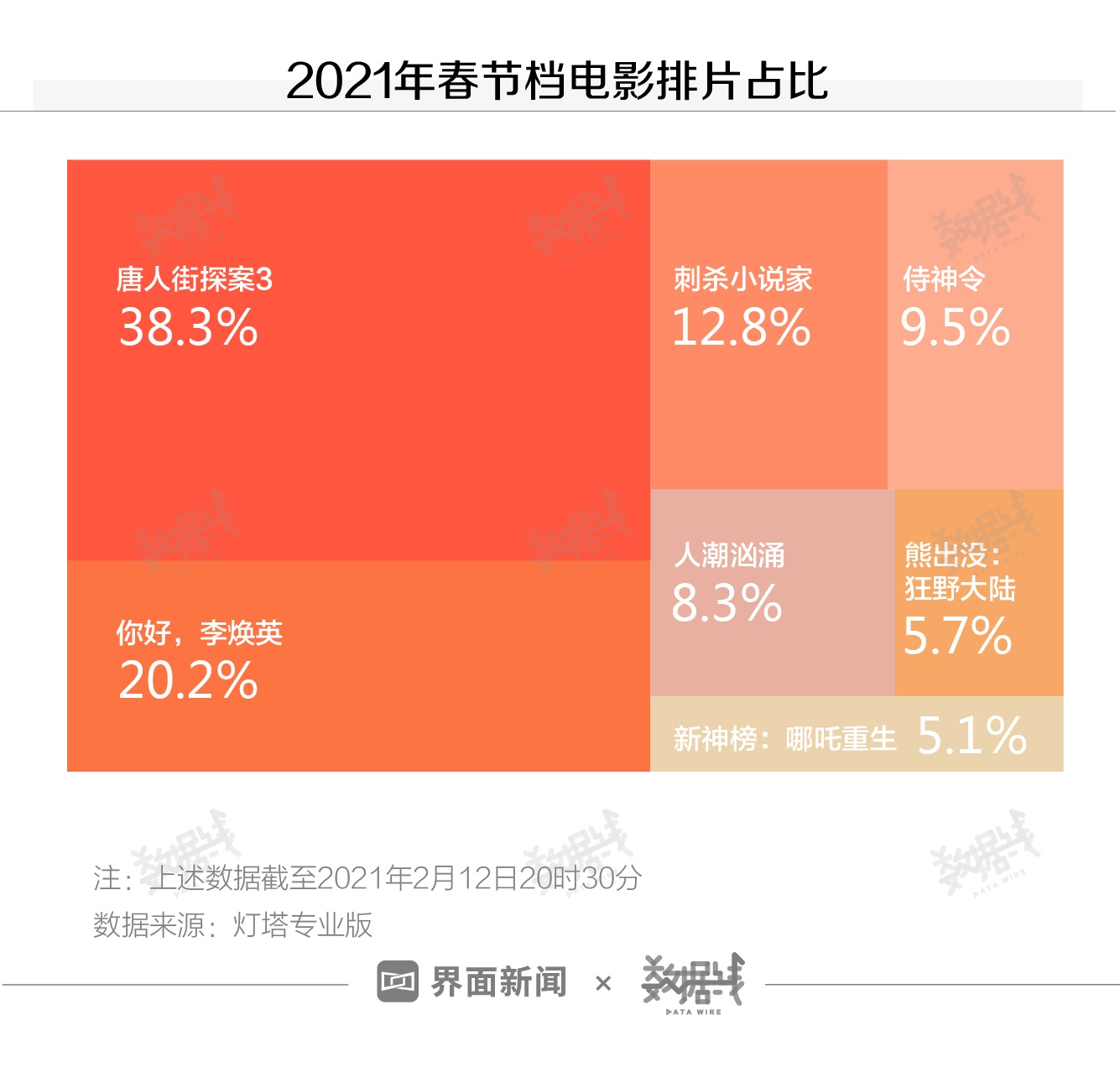 从排片占比来看,截至2月12日20时30分,《唐人街探案3》排片占比最高,达到38.3%,其次是《你好,李焕英》(20.2%)。