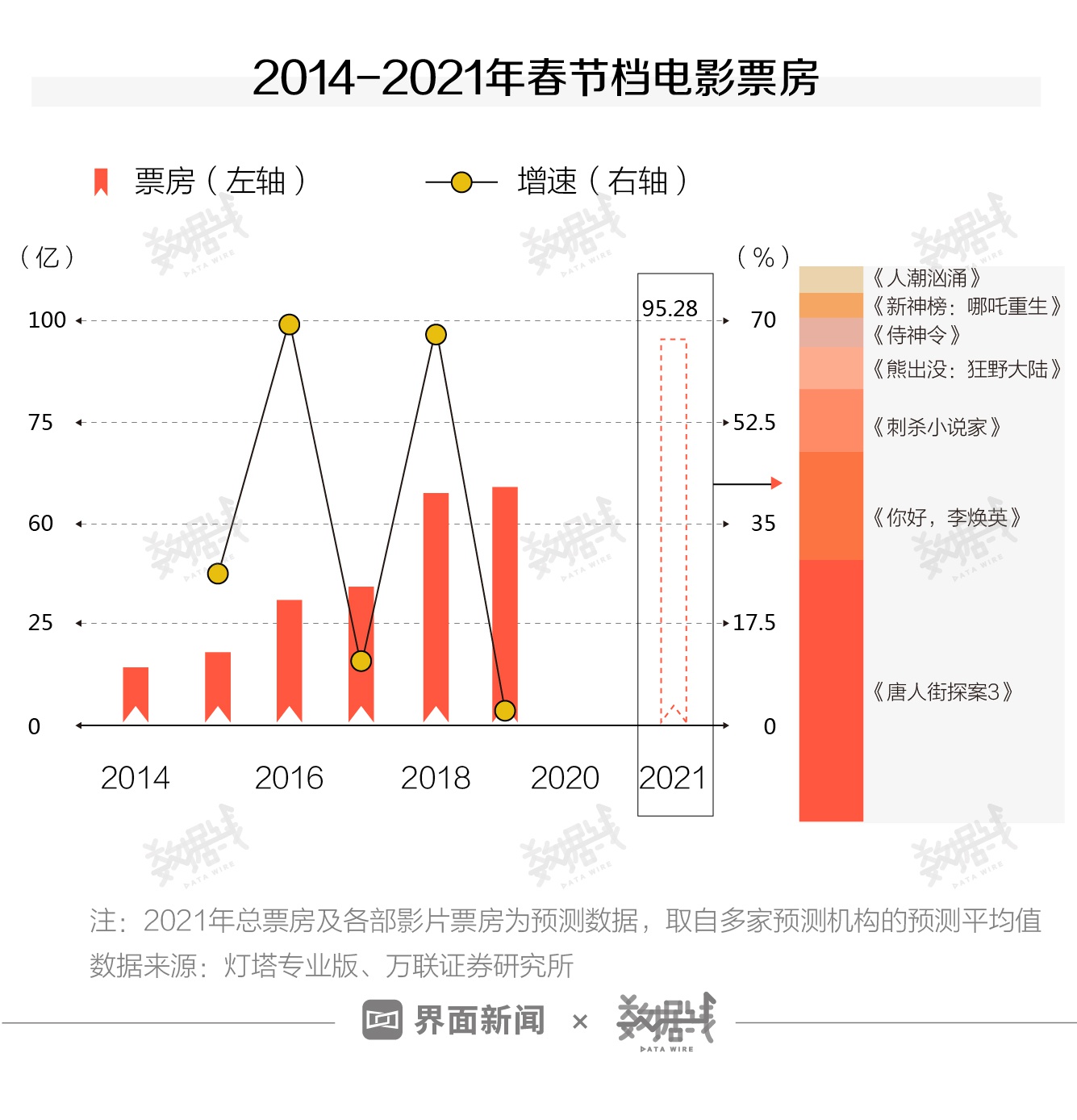 如果以10%的春节档全年票房占比来推算,依据中金公司此前预测,在乐观情形下,2021年全年票房将达到705.3亿。