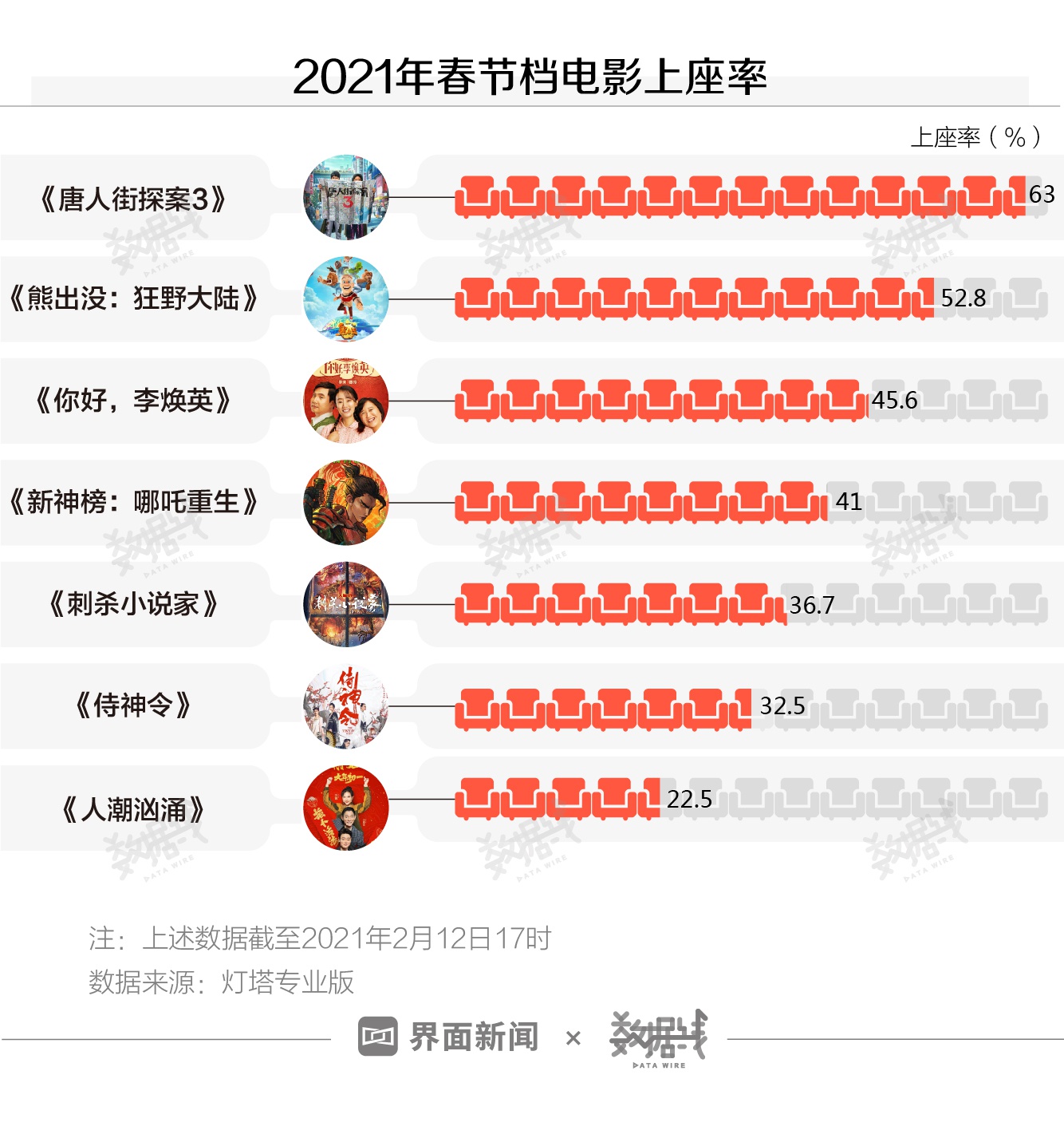 从上座率来看,截至2月12日17时,《唐人街探案3》上座率已达到约63%,这意味着在有100个座位的放映厅中,仅约37个座位空着。据北京市疫情防控此前要求,春节期间北京各影院每个场次的观影上座率不得超过50%。