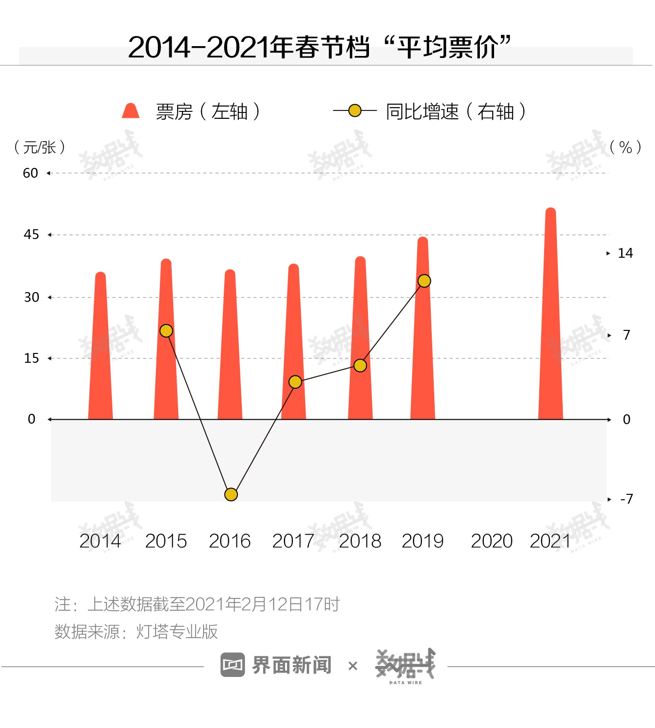 尽管有“就地过年”电影优惠券、购票平台优惠活动,今年春节档电影票价还是涨了,而且涨得不少。据灯塔专业版数据,截至2月12日17时,今年春节档平均票价约为51.8元,较疫情前的2019年涨了近16%,创下除2020年以外近6年春节档电影平均票价新高。