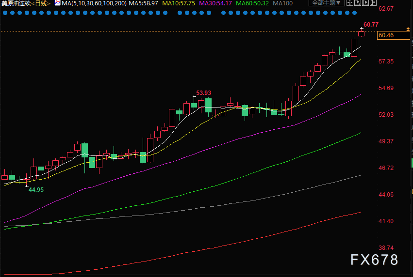 油价上周五(2月15日)攀升逾2%,周一(2月15日)亚市盘初,美原油一度续涨逾2%,上破60美元关口,再创2020年1月8日以来新高至60.77美元/桶,因市场希望美国经济刺激计划将提振经济和燃料需求,而随着主要产油国减少供应将趋于紧张。