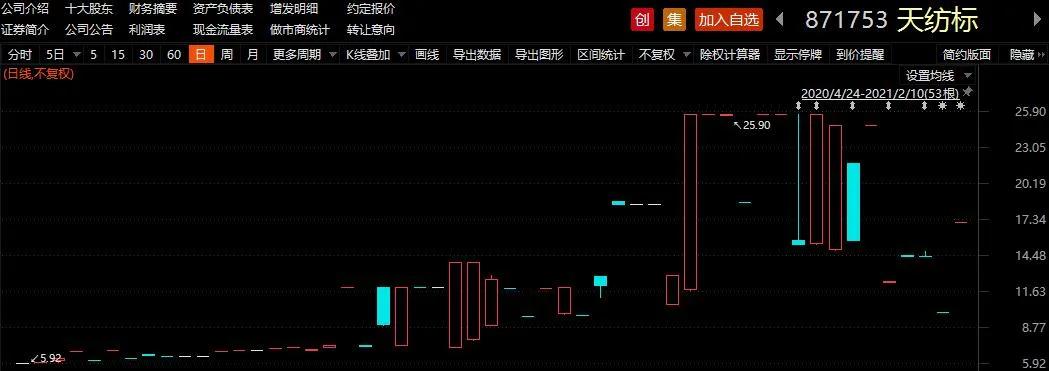 二级市场上,天纺标的市值也出现攀升。2020年4月以来该股在全国股转系统交易出现活跃,去年底一度出现大涨,春节假期前最后一天交易收报17.2元,总市值将近12亿元。