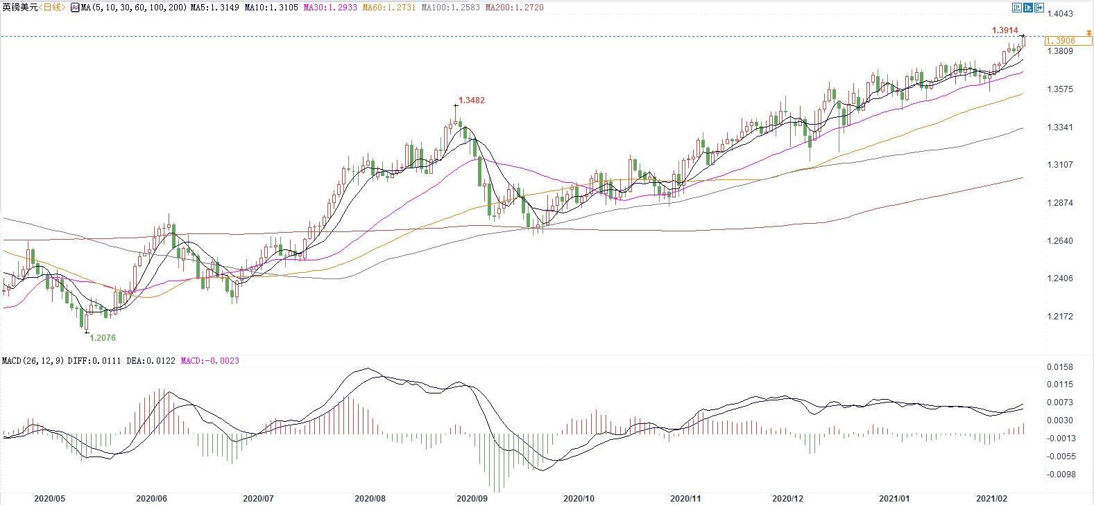 创下34个月新高1.3914,这是受全球股市上涨和这样一种预期推动:英国经济将因疫苗接种出现强劲复苏。