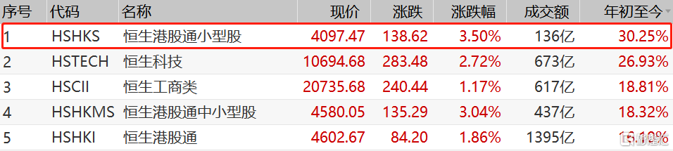 恒生港股通小型指数今年内累计涨了30.25%,在港股主要指数中表现最强,甚至跑赢了大家一直高度关注的恒生科技股指数。