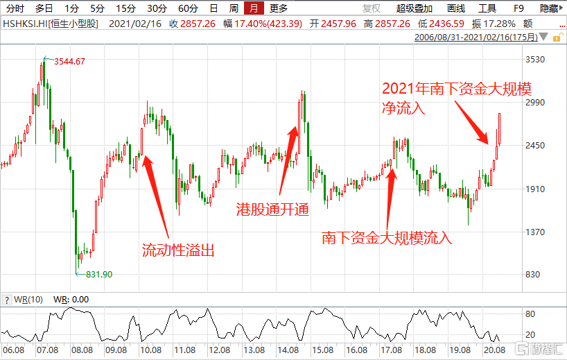 第三个是2017年,港股通南下资金首次出现大规模持续净流入,刺激包括小票股在内的港股大牛市;