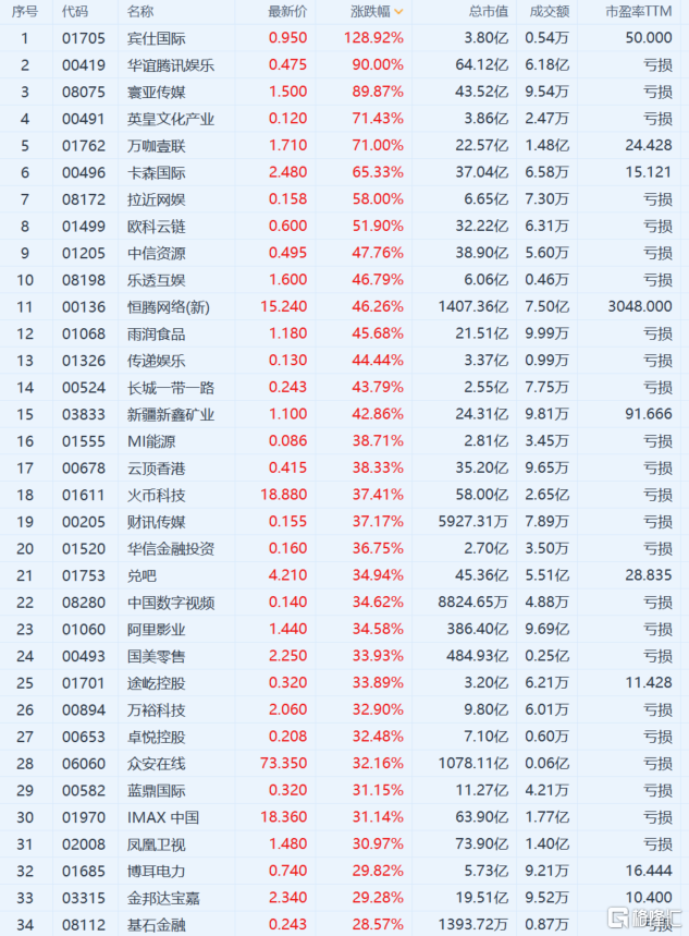 今天的小票股行情中,开连锁茶饮的宾仕国际因同行奈雪的茶计划来港上市被哄炒翻倍;华谊腾讯娱乐、寰亚传媒、英皇文化产业、拉近网娱、乐透互娱、传递娱乐这些但凡跟“影视娱乐”有字面关联的小票都被爆拉了数十个点。