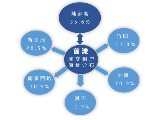 前滩商务区在2020年表现亮眼,不仅局限于新设企业租户,对其他传统商务区的吸附效应也较为明显,全年上海大面积(≥8000㎡)成交租户中,前滩商务区占比近一半。
