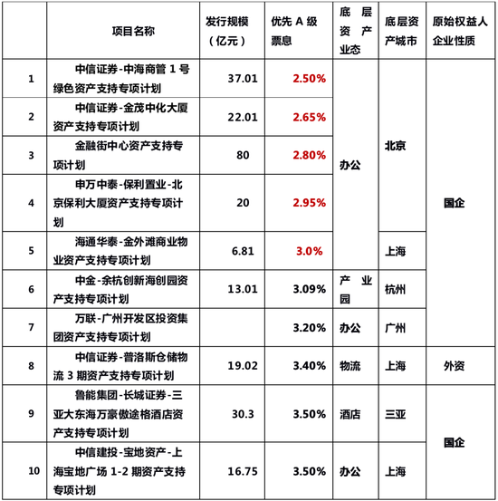 在“灵活稳健”的货币政策总基调下,央行多次释放流动性呵护市场。疫情背景下,机构的投资策略则趋于保守,大量资金涌向国企一线城市核心地段优质办公资产ABS产品。按ABS优先A级产品发行票息由低到高排行,发行票息最低的前5位均为一线城市核心地段国企办公资产,发行利率均不高于3%。而在发行票息最低的TOP10存量资产ABS产品中,办公资产占据了7席,均为一线城市核心区域优质办公资产,发行主体方面,国企更是占据9席,“优质主体“+“优质资产”的双保险成为市场资金的“最优选择”。