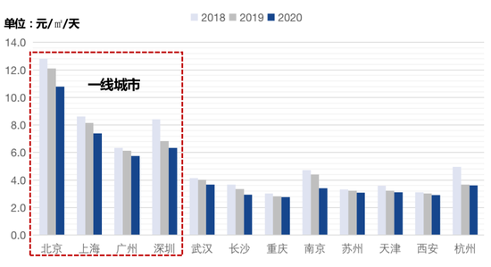 近三年,全国重点办公城市的甲级写字楼平均租金均为连续下降趋势; 截止20年四季度,北京以11.3元/㎡/天领跑全国;在大量新增供应,供大于求的结构下,深圳近几年与广州的租金差持续缩小。重点二线城市与一线城市的租金差仍较为明显,分别为3.2元/㎡/天和7.6元/㎡/天。