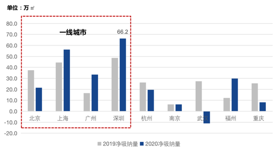 据CAIC重点城市监测显示,2020全年一线城市中仅北京净吸纳量同比下降,年中两次疫情反复对北京办公租赁成交影响较大;上广深净吸纳量同比均有较大幅度的上升,其中深圳更是以66.2万㎡领跑全国,科技行业受疫情影响较小,深圳下半年需求反弹明显、表现强劲,贡献了全年近5成净吸纳量。