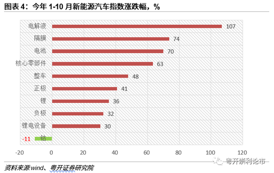 细分行业板块看,电解液、隔膜和电池板块涨幅居前,分别上涨106.86%、73.63%和70%;全部细分板块中仅钴板块较差,期间下跌10.89%。