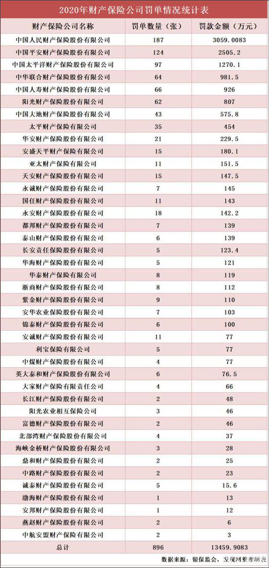 在具体的公司方面,2020年41家财产保险公司被行政处罚,累计收到896张罚单,罚款1.35亿元。