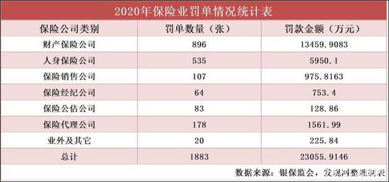 据发现网不完全统计,2020年1月1日-2020年12月31日(以作出行政处罚的日期为准),包括银保监会、银保监局以及各地银保监分局在内的监管系统对保险公司及其个人共开出1883张罚单,累计罚款2.31亿元。