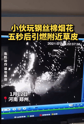 1月12日,在河南郑州,据小区监控显示,一小伙玩“钢丝棉烟花”,五秒后迅速引燃附近草皮,所幸扑救及时,这才没有酿成大祸。