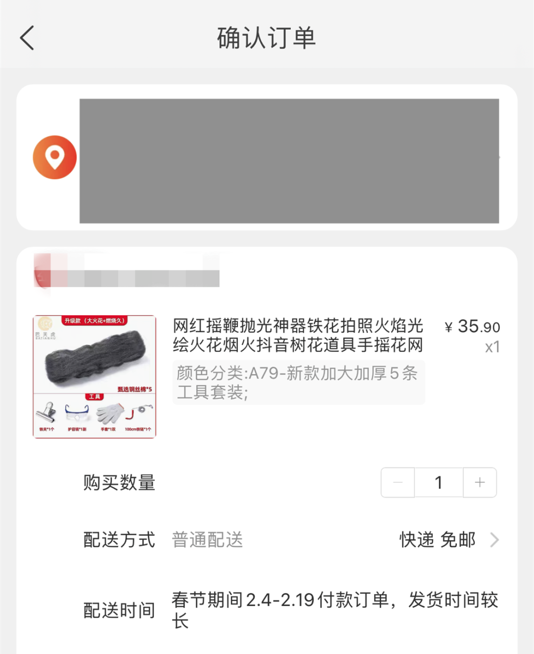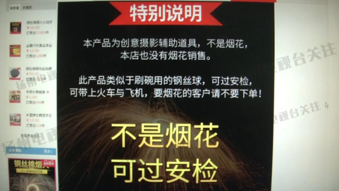 之前曾有卖家宣称,“钢丝棉烟花”不是烟花,可过安检。还表示为防范火星,他们普遍配套了护目镜、手套等防护用具,但是对于使用场所,商家却表述模糊。