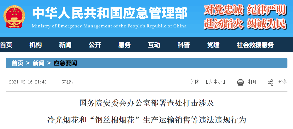 2月16日,国务院安全生产委员会办公室组织召开专题会议,部署查处打击涉及冷光烟花和“钢丝棉烟花”生产运输销售等违法违规行为,并印发通知,提出要求。