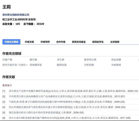 据中国知网公开数据显示,王莉总计发表包括《茅台酒生产过程中的微生物研究进展》《酱香型白酒酿造微生物代谢产平台的研究进展》《“十一五”期间茅台集团白酒风味物质研究平台建设及应用回顾》等论文105篇,研究方向包括:“茅台酒”“酱香型白酒”“酿酒高粱”等,总下载量达20320次,最高引用量为77次。