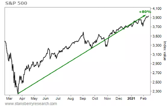我们再来看看如今标普500指数的表现,如下图,标普500指数从2020年低点至今涨幅已超80%。