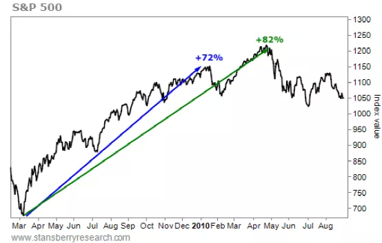 如上图,标普500指数在2009年至2010年初最高上涨了82%,但也就在经济意外指数出现滞涨后,标普500指数也闪电回调了17%。