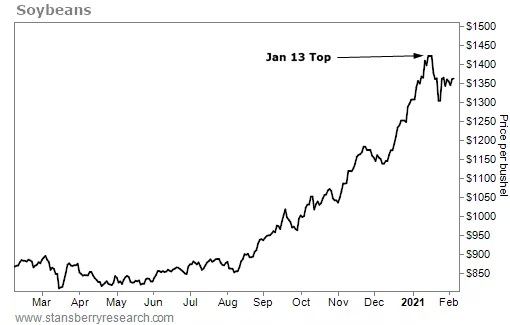 1月13日大豆价格创了新高,随后后下跌,近期可能会出现一个相对低的高点。就像股票一样,大豆价格在2020年三四月的低点后出现大幅反弹。