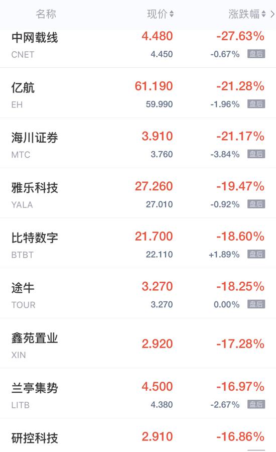 玖富涨超34%,云米涨超22%,蛋壳公寓涨超16%,物农网涨超12%,360数科涨超11%,嘉银金科涨超10%;亿航跌超21%,途牛跌超18%。