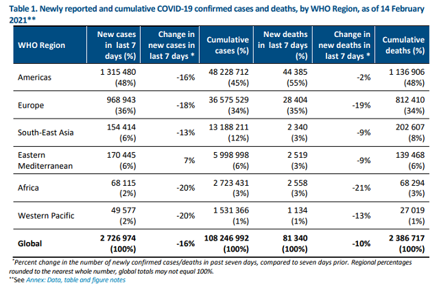 WHO的数据显示,2021年到目前为止,全球每周报告的病例数量已下降了近一半,从1月初的一周500万例下降到2月8日至15日的270万例,不过,新冠变异毒株在非洲等地也有所蔓延。