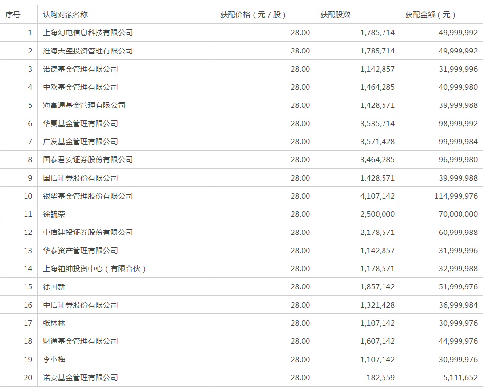 公告显示,此次定增对象包括中欧、华夏、广发等多家知名基金公司。其中银华基金获配金额超1亿元。