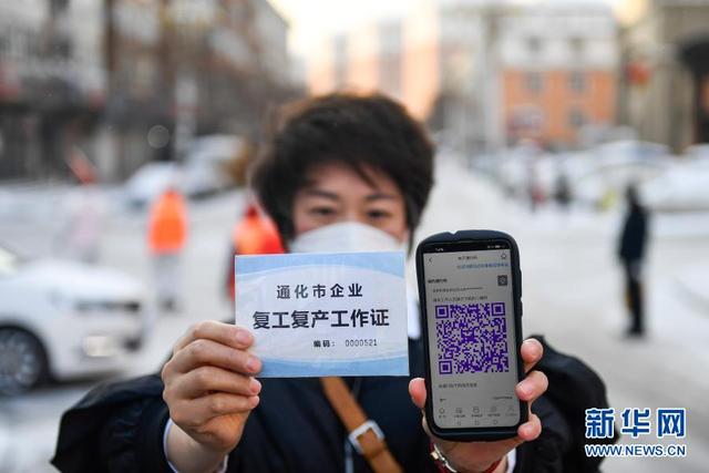 鲁春梅展示配发给复工复产人员的工作证和紫色健康码(2月16日摄)。