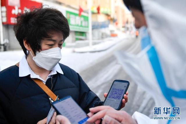 鲁春梅向社区卡点值守人员出示复工复产人员的紫色健康码(2月16日摄)。