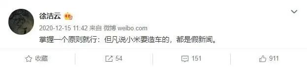 2020年年底即传出小米携手比亚迪联合造车的声音,随后小米方面回应称“小米没有造车计划”。小米总办副主任徐洁云在个人微博上发文称,“掌握一个原则就行:但凡说小米要造车的,都是假新闻。”