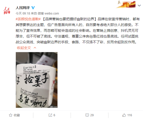 针对茶颜悦色品牌宣传被指侮辱女性一事,人民网发表评论称,品牌在做宣传营销时,都有其想要表达的主题,但广告是面向所有人的,自然要考虑绝大部分人的感受。不能为了宣传效果,而忽略可能会造成的社会影响。在营销上搞创意、抖机灵无可厚非,但不可破了底线。守法遵规,尊重公序良俗是红线也是底线。任何试图挑战公众底线、突破幽默边界的手段、套路,不仅添不了彩,反而会起到反作用。