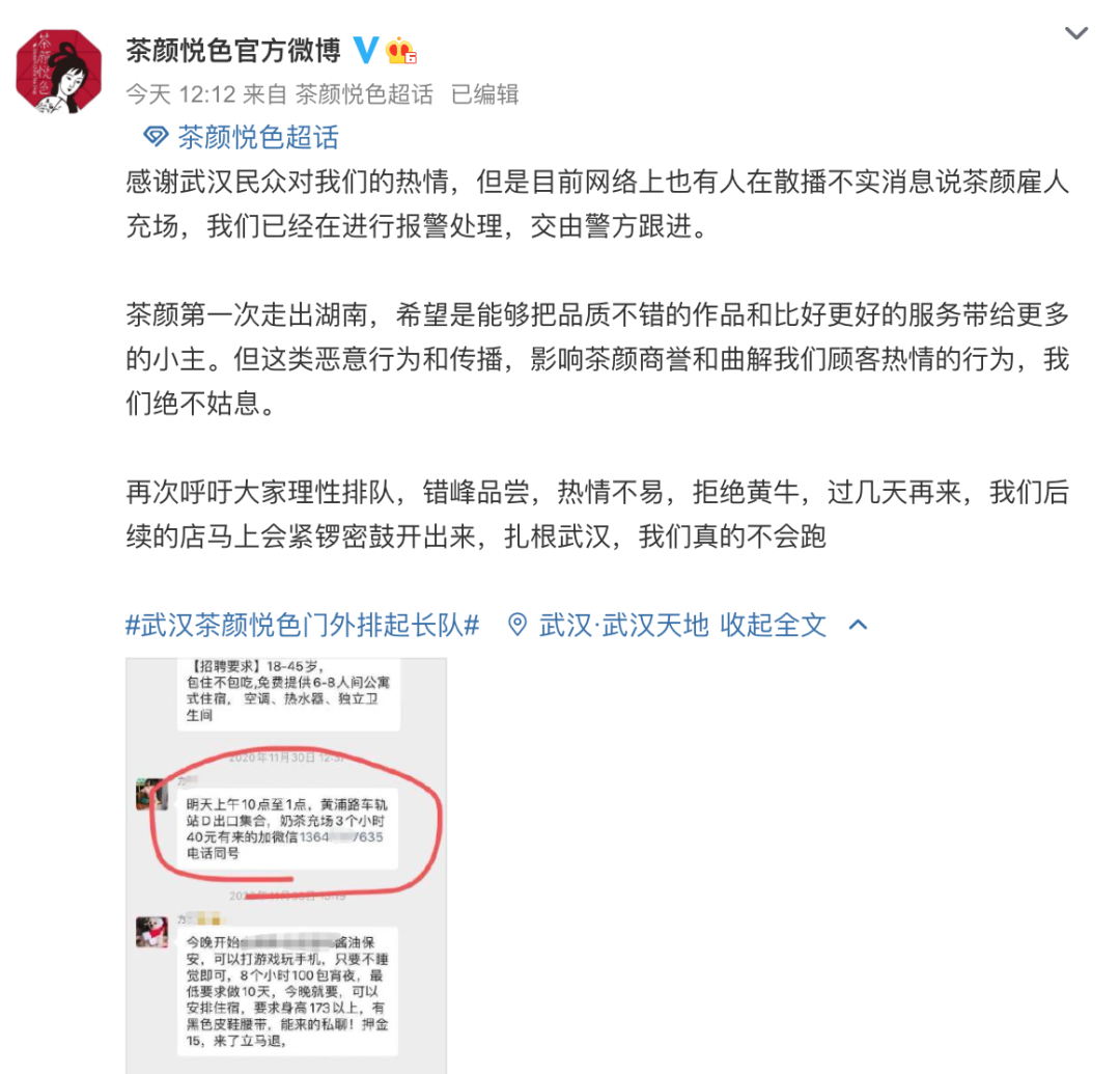 当日中午12时,茶颜悦色官方微博针对网上出现的“雇人充场”进行了回应: