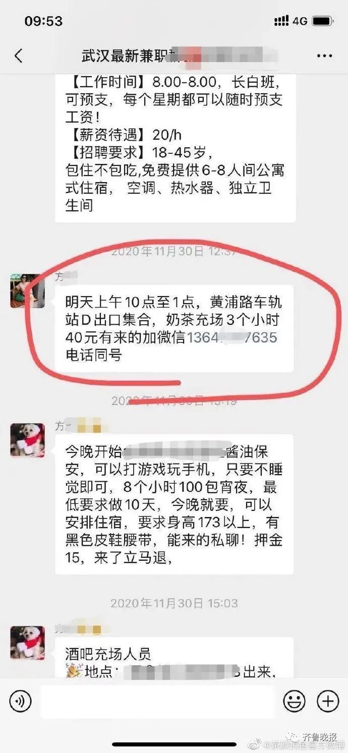 当天,网络上流传一张“奶茶店充场3小时40元工费”的群聊截图,称需要二三十位“虚假顾客”充数。
