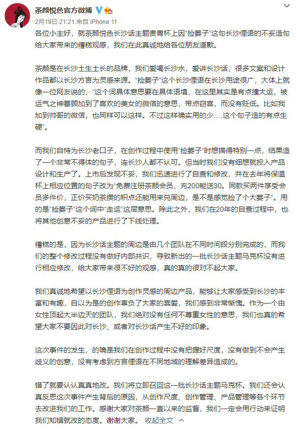 2月19日晚间,茶颜悦色发布致歉声明称:“就茶颜悦色长沙话主题贵胄杯上‘捡篓子’这句长沙俚语的不妥造句给大家带来的糟糕观感,我们在此真诚地给各位朋友道歉。”
