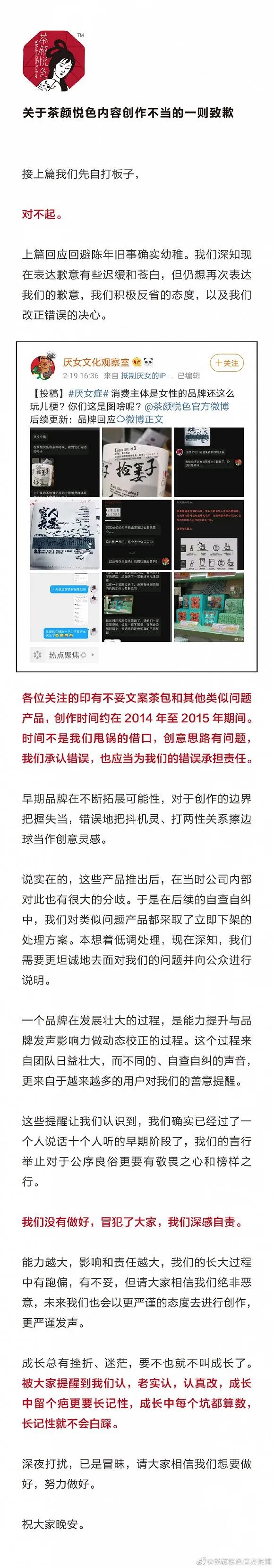 茶颜悦色表示,网友关注的印有不妥文案茶包(官人我要)和其他类似问题产品,创作时间约在2014年至2015年期间。“早期品牌在不断拓展可能性,对于创作的边界把握失当,错误地把抖机灵、打两性关系擦边球当作创意灵感。”