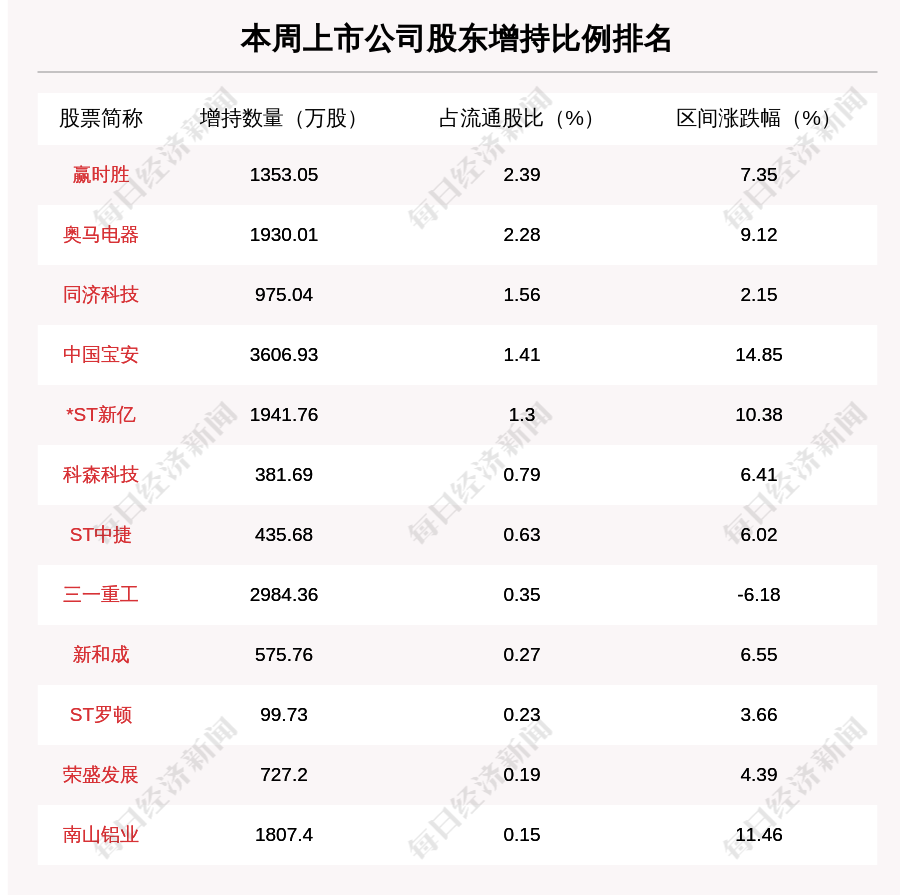 从增持力度上来看,本周获股东增持比例(占流通股比)前三的公司是赢时胜、奥马电器、同济科技,增持比例分别为2.39%、2.28%、1.56%。