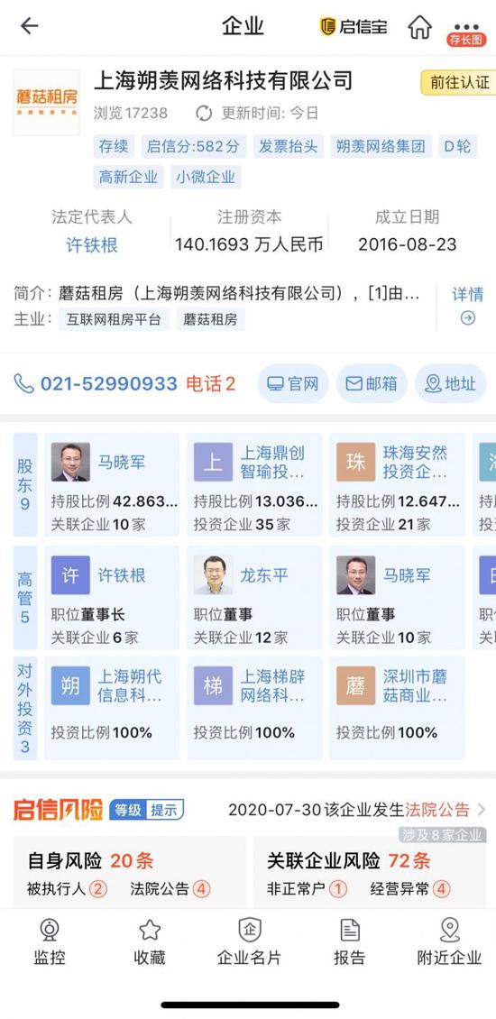 启信宝显示,1月6日,上海朔羡法人代表由马晓军变更为许铁根。许铁根在蘑菇租房只担任董事长一职,没有任何股份。