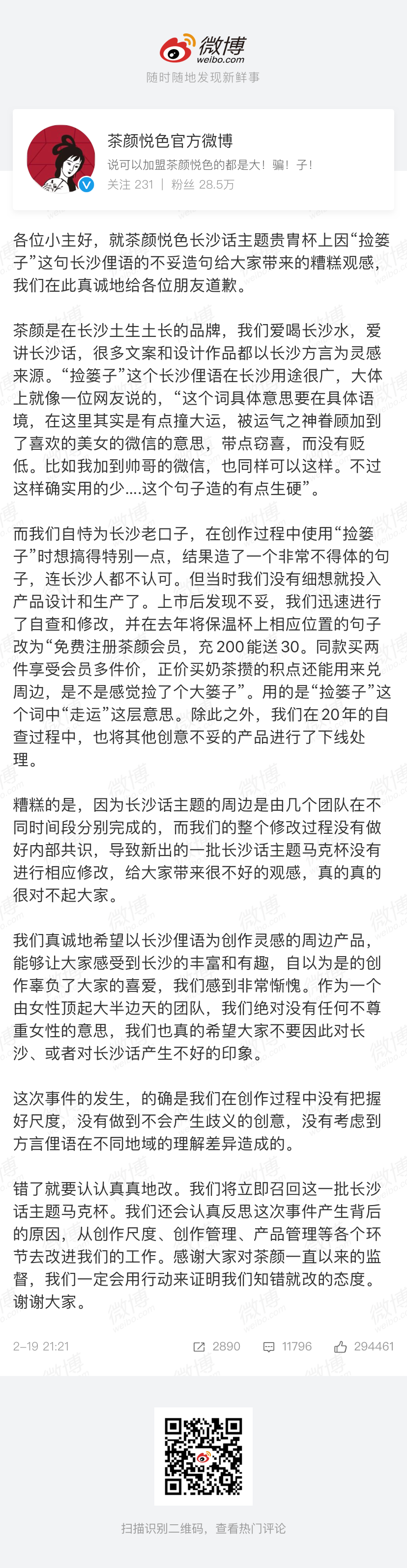 2月19日晚,茶颜悦色在其微博致歉:“就茶颜悦色长沙话主题贵胄杯上因“捡篓子”这句长沙俚语的不妥造句,给大家带来的糟糕观感,我们在此真诚地给各位朋友道歉。”