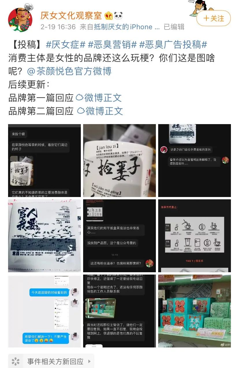 2021年2月19日,网友“厌女文化观察室”在微博发布了一组关于茶颜悦色广告创意的一组图片,配发文字:“消费主体是女性的品牌还这么玩儿梗?你们这是图啥呢?”