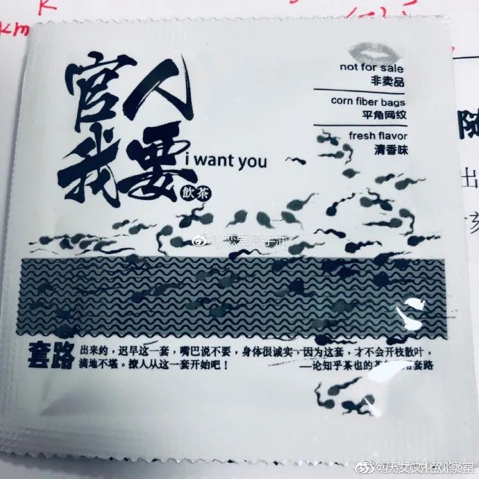除了“捡篓子”马克杯,网友公布的还包括茶颜悦色一种茶包的图片,上面印有“官人我要”四个大字,下方的小字体为“饮茶”,一旁的英文为“i want you”。茶包下方一段关于“套路”的文字结尾为:“撩人从这一套开始吧!”