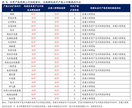 已经开始或即将开始产能周期上行、且超额收益对产能扩张敏感的行业存在结构性投资机会。由于在产能周期上行的中前期,行业超额收益表现最为显著,因此我们优先选取当前产能周期初现苗头的行业,即(1)构建各类资产现金支付和在建工程增速刚开始同时上升,产能周期即将开启的行业;(2)在建工程尚未回升,但构建各类资产现金支付已经开始上行,有望传导到在建工程的行业;(3)构建各类资产现金支付和在建工程增速已经处于历史最底部,有望迎来周期反弹的行业。筛选结果包括钢铁、有色金属、公用事业、汽车等9个一级行业和煤炭开采Ⅱ、采掘服务Ⅱ、化学原料等32个二级行业。(表5展示已经初开始产能扩张的行业,后两类产能周期即将上行的行业见文末附表)