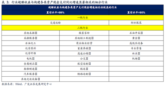 2. 行业超额收益与构建各类资产支付的现金同比增速显著相关的细分行业:置信水平为99%的一级行业有交通运输共计1个,二级行业有其他采掘Ⅱ、采掘服务Ⅱ、石油化工等19个;置信水平为95%的一级行业有纺织服装共计1个,二级行业有石油开采Ⅱ、黄金Ⅱ、高低压设备等6个。