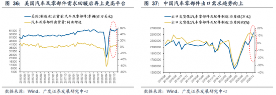 汽车零部件Ⅱ:中美汽车零部件行业需求回暖,产能扩张在即,新一轮库存周期的开启进一步加强行业上行逻辑,建议关注具有技术壁垒和品牌壁垒的优质标的。当前美国汽车零配件行业的产能周期、库存周期当前均已触底,而中国汽车零部件行业则是产能周期触底、库存周期初回升。美国汽车及零部件行业需求自2020年Q2逐渐改善,经历Q3的平稳波动后,于Q4有稳定上升的趋势,出货量同比增速于近期转正。而国内乘用车销量有所回升,同时汽车零部件出口交货值也呈趋势向上,行业内外需同时改进。在行业景气度持续回暖过程中,中美汽车零部件行业的产能周期和库存周期或将迎来共振,其中具有技术壁垒和品牌壁垒的优质标的将在电动车渗透率大幅上行的未来取得更高的市场占有率。例如,华域汽车致力于推进公司自主可控发展,构建公司的技术护城河,汽车零部件行业的产能扩张也将为公司带来增长空间。公司众多业务具备全球竞争力,当前已经实现汽车照明自主掌控、明确乘员智能安全系统的独立自主发展、自主发展传动系统关键部件并独立发展全球汽车内饰业务,同时公司支出资本开支积极开拓新能源、智能驾驶领域等赛道,随着从疫情中逐渐恢复,产能扩张带来更大增长空间。