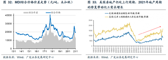 化工:海内外化工产品需求增加,下游迎来量价齐升,库存周期和产能周期的共振上行有望进一步强化行业的景气周期,关注优质产能持续投放的化工下游企业。2020年,疫情对全球经济造成严重冲击,中国化工行业在建工程增速迅速下降,美国化工产能则继续出清,在产能周期底部震荡。但进入20Q4,化工部分产品的需求迅速恢复、价格回升,行业景气度开始回暖。展望2021年,国内外需求恢复将持续拉动产品涨价及盈利回升——农产品价格的进一步走高,带动农化需求增加,且油价上行进一步推动农化产品价格上行;此外,伴随海外疫情好转、生产逐步恢复,顺周期产品的价格持续上行,我国出口需求维持高位,其中化工产品首当其中。另一方面,MDI行业景气有望持续上升,供给端,MDI核心工艺由万华化学、巴斯夫等七家公司掌握,行业集中度较高,近3年产能有序扩张;需求端,海内外地产需求旺盛,进一步加强化工原料的需求,其中美国房地产市场仍处于上行周期,房屋销售仍在上行过程当中,促进建筑保温材料和冰箱冷柜市场的需求进一步放大,形成拉动MDI消费量增长的重要力量。展望2021,MDI价格中枢在后疫情时代的经济复苏带动下较2020年将有所上行。而当前中美化工行业的库存增速均处于5年来的低位,有望同时迎来主动补库的周期,库存周期和产能周期的共振上行有望进一步强化行业的景气周期。从上市公司角度来看,例如,万华化学作为全球MDI供应龙头,在全球MDI供应中占有较大供给主动权,2021~2025年将继续新增产能130万吨,公司处于大规模资本开支时期。展望2021,后疫情时代的顺周期复苏有望持续推动公司业绩增长。展望长远,公司持续的资本开支与研发投入,香精香料、改性塑料、尼龙12、锂电材料等项目有望陆续建成达成,持续抬升公司业绩中枢。