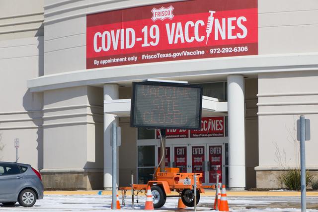 2月19日,在美国得克萨斯州达拉斯市北郊,一家疫苗接种中心外的显示屏显示关闭的字样。新华社发 (田丹摄)