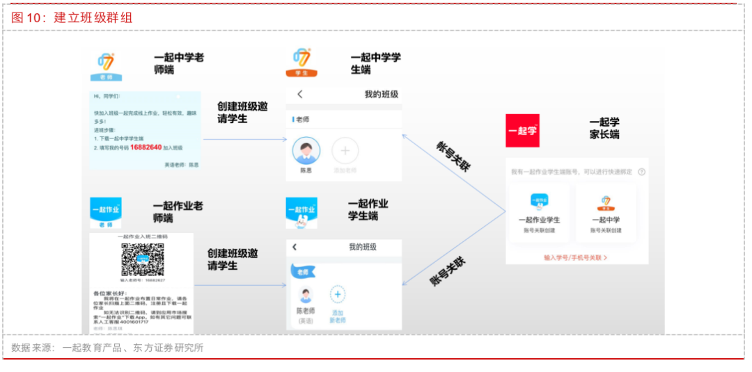 一起教育搭建校内产品闭环,功能体系完善。产品体系主要包括一起老师端、学生端和家长端。从关系来看,学生账号可以同时绑定家长和老师,家长和学生可以同时看到老师发布的信息,以及学生学习成绩和考试情况。从功能来看,家长端有网校入口、家长大学,教师端有布置考试作业、教研功能,学生端可以提交完成作业、搜题等功能,功能完善。 以注册流程和发布作业为例,产品充分实现了信息在学生家长老师之间的交互。