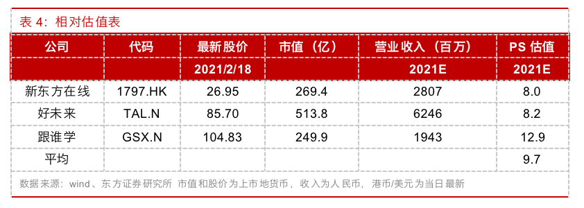 投资建议进校业务积淀壁垒突出,在线大班商业化变现进入兑现阶段,预测公司20-22E年收入为12.8/27.7/56.6亿元,选取好未来、跟谁学、新东方在线为可比公司,21PS为9.7x,对应市值41.6亿美元,目标价为22.12美元,首次覆盖给予买入评级。