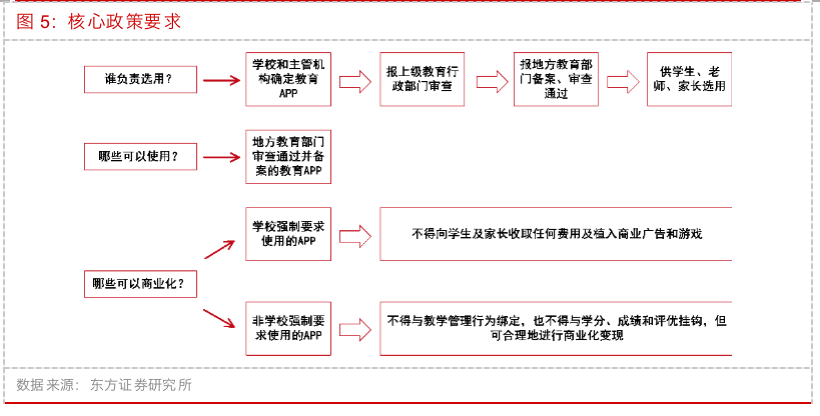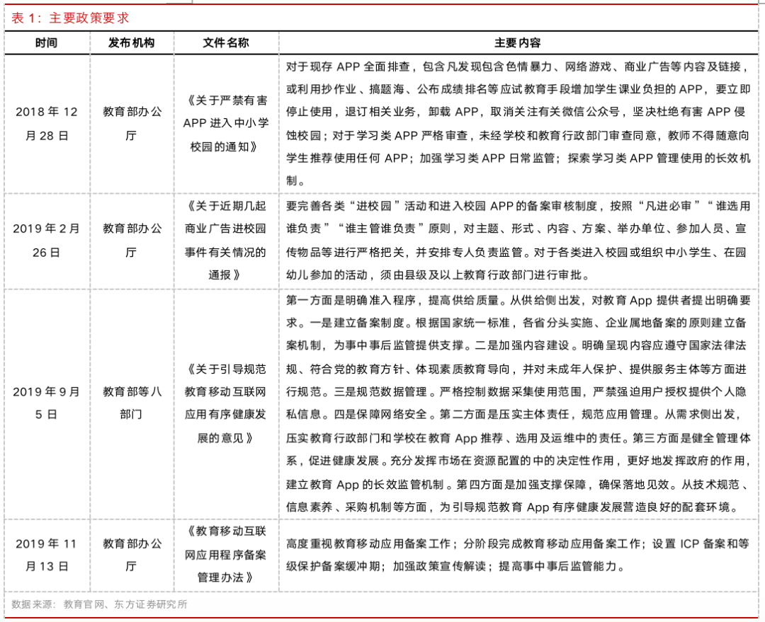 18年开始政策监管连续落地,明确产品边界。18年12月教育部出台《关于严禁有害APP进入中小学校园的通知》,要求各级主管单位严格审查进入校园的学习类APP,建立学习类APP日常监管制度。后续国家先后出台《关于引导规范教育移动互联网应用有序健康发展的意见》和《教育移动互联网应用程序备案管理办法》具体细化管理,解决了谁负责选用?如何实现商业化?等核心问题。