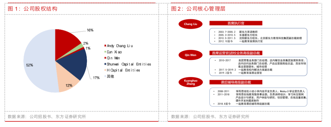 管理层优势互补,能力卓越。创始人兼CEO刘畅,曾任新东方集团助理副总裁、沈阳新东方校长,具有丰富的教学经验,持有公司股权15.5,%,投票权81.7%。联合创始人兼董事肖盾在剑桥大学电子信息工程专业完成学士和硕士学位,对于大数据和人工智能具有深刻理解,在教育与技术结合上有更好的融合。同时引入前美团和学而思网校高管,管理团队能力优势互补,助力公司快速成长。