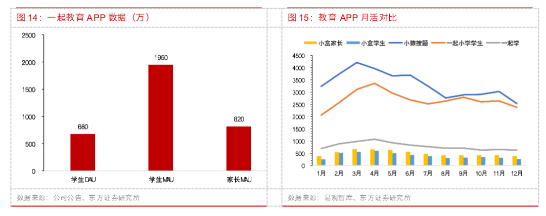 1)进校流量挖掘空间大。一起学产品已在360个城市的7万多所K12学校,一起作业(一起小学)MAU超过2000w,与小猿搜题规模相近。